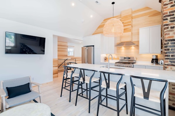 Living Room – King-size luxury memory foam sleeper sofa + shared ½ bath
