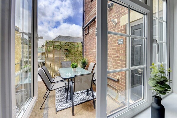 * Terrace area with outside furniture - enjoy those sunny evenings with a glass of wine outside overlooking the New Brewery Arts.