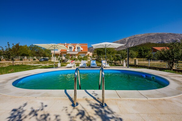 The swimmingpool is around 4m by 2,5m. There are a lot of fruits growing in the garden.