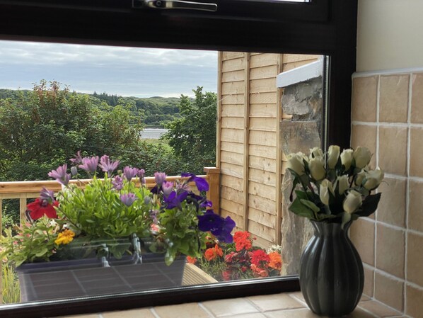 The accommodation is all on one level and compromises of a combined kitchen, dining and lounge area, and a bedroom and bathroom area which is screened from the living area. The lounge area opens onto a decked area via sliding doors, which offers outdoor furniture and overlooks the inner harbour of Clifden Bay. The fully equipped kitchen has all modern conveniences including, oven, hob, microwave, kettle, toaster, dishwasher, fridge freezer, washing machine and dryer. The lounge area is furnished with a comfortable seating, coffee table, and TV. The dining table seats 4 persons and is located adjacent to the kitchen. The bedroom is furnished with a double bed, and ample storage for clothing and belongings. The bathroom is adjacent to the bedroom and includes WC, sink, shower and heated towel rail. This property is not suitable for children and there is no capacity for additional beds or cots.