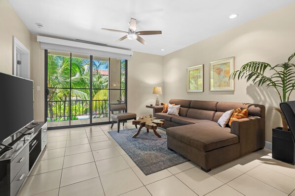 - Living room with large couch and Smart TV
