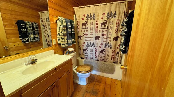 Sleeping includes 1 queen sized bedroom, a bunk room, and full bathroom on the main level, plus 2 queen bedrooms (queen + twin) and full bathroom on the upper half loft. Combined, very comfortable sleeping accommodations for up to 14 people. For travelers with small children, a playpen/crib and high chair are included. To complete this cabin, it has a full-size washer and dryer, iron and ironing board, and hair dryer. Plus, we provide all bed linens, bath towels, toilet paper, laundry detergent and fabric softener, dishwasher detergent, and dish soap. And for your entertainment, you’ll find games for all ages. All you need to bring are your personal items, food and a camera!