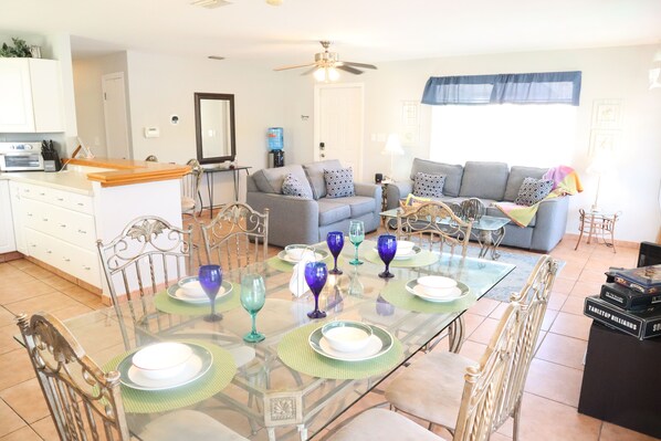 The kitchen has lovely appliances, and we recently installed a new microwave and air fryer for those looking for healthier alternatives. There's even a freezer outside that can be used for bait and your fresh catch. We offer both a traditional coffee machine and a Keurig K-Compact for those seeking something different ( feel free to bring your favorite flavors).