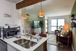 Located in the heart of the city, this Contemporary Boutique apartment offers a private retreat with modern comforts. Enjoy a fully equipped kitchen, new stainless appliances, and one dedicated parking space. Relax on the couch in the living room or unwind in your own bedroom with a queen-sized mattress.