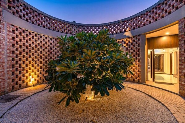 Escape to The Brick House, a unique architectural masterpiece in Delhi. Experience the perfect blend of traditional craftsmanship and modern design as you unwind in its expansive courtyards, stroll through landscaped gardens or relax by the private pool with loungers that overlooks lush surroundings. Discover tasteful interiors with striking artwork and enjoy access to amenities such as a designated games room, 400 m walking track for outdoor enthusiasts.
