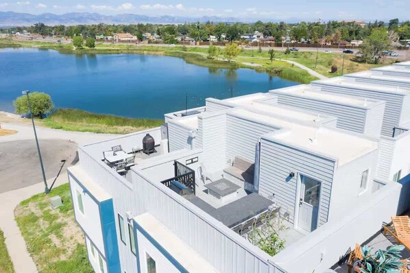 The spacious rooftop has a gas grill, outdoor prep station, and mini fridge, an island with seating, a smart TV, a fire pit, and gorgeous mountain/lake views.