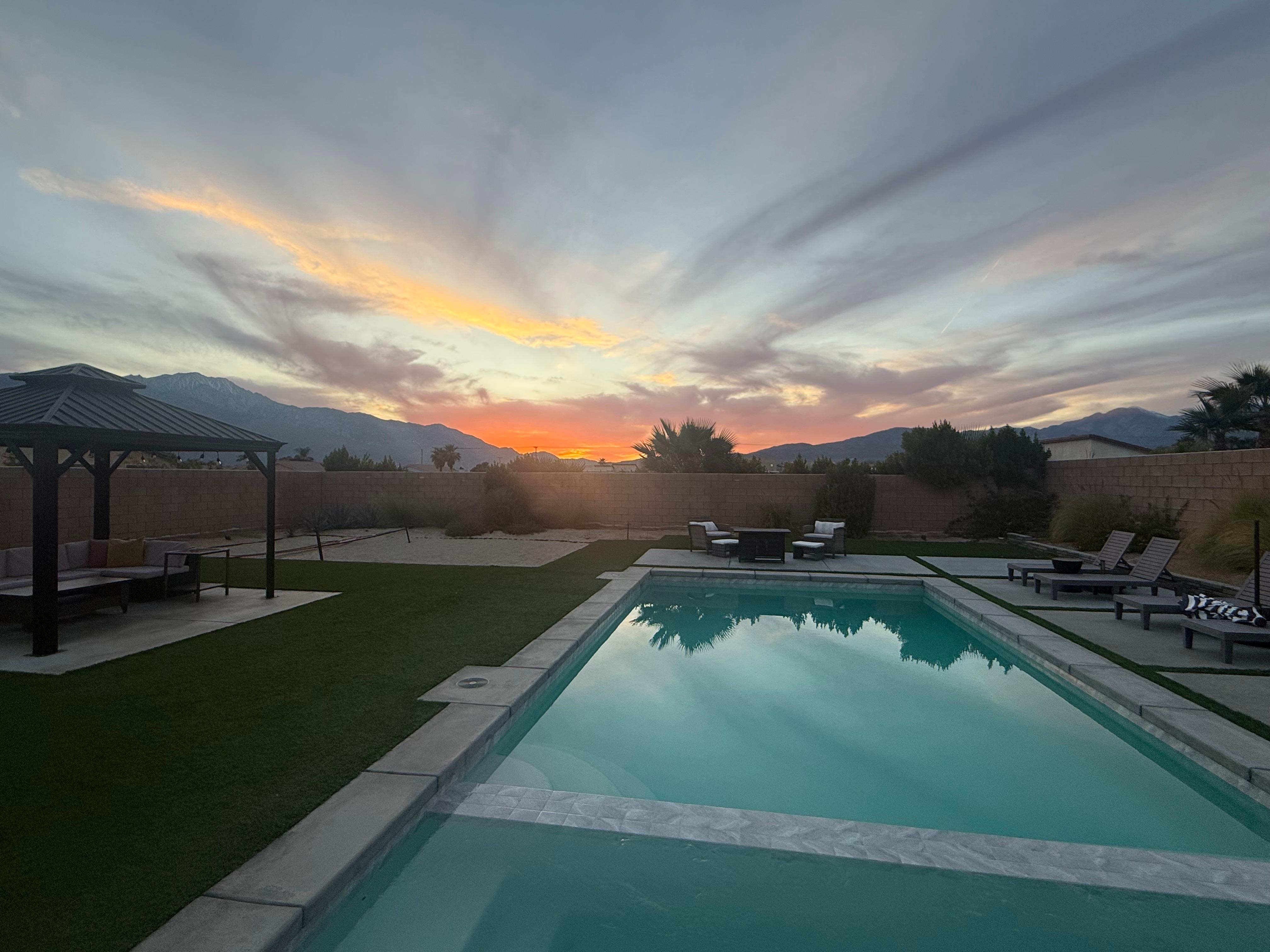 No need to go to a Resort…it is all here in the backyard! Enjoyed the pool, large spa, volleyball court and sitting areas, and all the toys for entertainment! The home is brand new and well kept…great space for a Desert getaway!