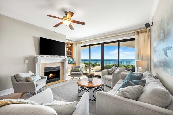 Open living and dining areas with stunning Gulf views.