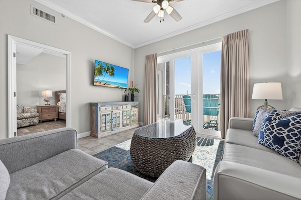 The open dining area offers plenty of seating for everyone, whether you’re gathering for a family meal or sharing stories from your day. Afterward, unwind in the comfortable living room, where you can watch the seagulls glide by or catch a favorite show. The furnished patio opens directly onto the pool deck and offers limited Gulf views, accessible from both the living room and the master bedroom—perfect for morning coffee or evening relaxation.