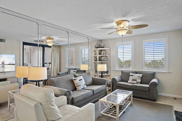 There is diagonally laid porcelain throughout the unit except for the bedrooms which are carpeted. Newer six panel doors with levered handles. The door leading into the master bedroom is at an angle so as to give a more open flow feeling. There are ceiling fans in the living room and both bedrooms. New windows in the guest bedroom provide excellent cross ventilation when desired. The living room has a 65" 4K UHD TV with a Smart Blu-Ray player, the master bedroom has a HD TV with a Smart Blu-Ray player and then guest bedroom has a HD TV with a Smart Blu-Ray player. | A second sliding glass door leads out from the living room to the balcony. There is updated lighting throughout the unit including over the breakfast bar. The mirrored walls add light and a more open feeling to the unit. The bedrooms have new carpeting and shutters.