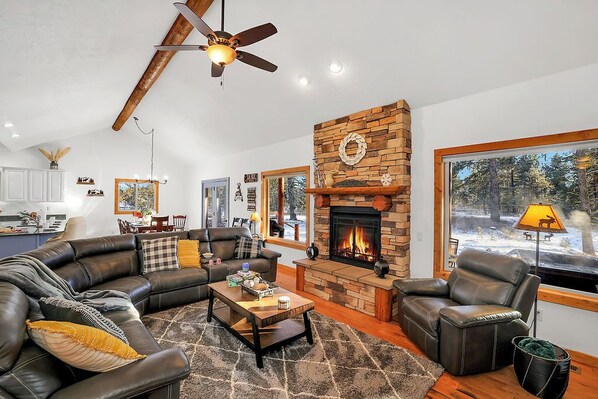 Open concept main level features a full bath, fully-equipped spacious kitchen for home cooking and baking (and great conversations around the dining table), cozy living area with a gas fireplace, vaulted ceiling, and plenty of windows to take in the scenic mountain views.