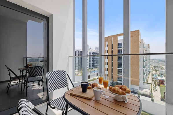 Located in Meydan, this modern apartment showcases Dubai's chic style with a voguish living space and stunning city views. Enjoy the comfy sofa, flat screen TV and dining table for two. The contemporary kitchen features top-of-the-line appliances while the balcony offers an outdoor seating area with a city view.