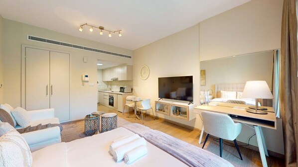 Nestled in the peaceful suburb of The Greens, this chic studio apartment offers a tranquil retreat for solo travelers or couples. With elegant furnishings and modern finishes, guests can unwind with high-speed Wi-Fi, enjoy a fully equipped kitchenette, relax on the furnished balcony with street views or take advantage of hotel-grade amenities like fluffy towels and linens.