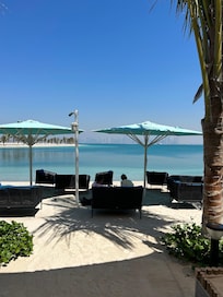 At Anantara World Islands Dubai Resort, guests relax on a private beach with cabanas and sun loungers. Enjoy Middle Eastern cuisine at three on-site restaurants. Activities include kayaking and beach volleyball. The spa offers rejuvenating body wraps.