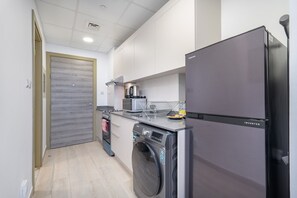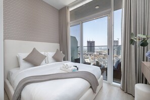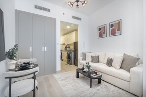 Sophisticated and Serene Studio Apartment With Stunning Skyline Views in JVC provides everything that you need. Stay connected with free WiFi in public areas.