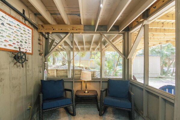 Step outside and enjoy the best of Lowcountry living! Beach Hut Cottage features spacious front and rear sundecks ideal for morning coffee or evening cocktails. Downstairs, relax in the screened-in ground-level patio, rinse off after a day at the beach in the enclosed outdoor shower, covered parking, and the laundry room.