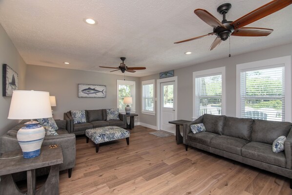 The bright and open main floor features the living room, dining area, and fully equipped kitchen—perfect for gathering after a day in the sun. The primary suite with a king bed and private bath is also located on the first floor, providing easy access and added privacy.