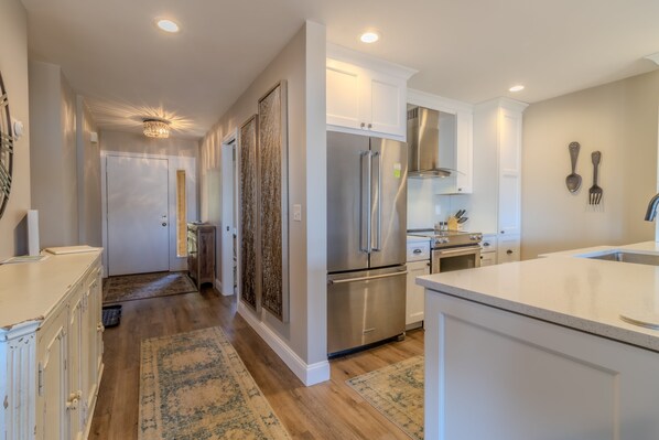 The primary bedroom, located off the living room, has a queen bed. The two guest rooms are off the main hallway- one room offers 2 queen beds and the other has a queen sized murphy bed and the space doubles as an office if you are planning to work remotely. With two bathrooms, there is plenty of space for 8 people to sleep and prepare for a day of adventure comfortably.