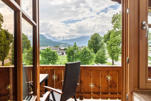 From the south balcony you have a beautiful view of the whole massif of the Wetterstein mountains, including the Alp and Zugspitze. You can also enjoy this view from the living and dining area as well as from the bedroom.