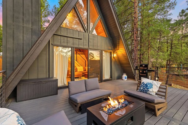 Downstairs, there’s a cozy queen bedroom and a full bathroom. Upstairs, the king loft bedroom offers a treehouse-like vibe with a front-row seat to the pines. Out back, a spacious deck overlooks the canyon—complete with a BBQ grill and fire pit that make sunset dinners feel extra special. And just out front? Another fire pit and your own private hot tub, perfect for soaking under the stars!