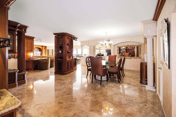 When you step inside, you're greeted with miles of ocean views within a luxurious world of refined comfort. The large open floor plan is adorned with travertine flooring, setting a tone of understated elegance. Offered fully furnished, this opportunity promises an effortless transition to coastal living. Extensive custom woodwork and built-ins throughout the condo highlight the unparalleled craftsmanship that defines every inch of the space. The formal dining room, together with a large second dining area with built-in bench seating and a spacious open kitchen, offers the perfect backdrop for entertaining guests, or for a more intimate dining experience, enjoy your meals from the smaller adjacent dining area with breathtaking views of the Atlantic Ocean, then retire to the balcony to take in the cool ocean breezes, spectacular sunrises, and mesmerizing moonlit ocean.
