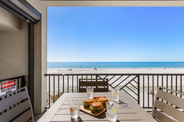 Oceanfront Luxury: With floor-to-ceiling sliding doors that open to a spacious balcony, you'll have breathtaking views of the Gulf. Enjoy the breeze and unwind with ample seating and an outdoor TV.