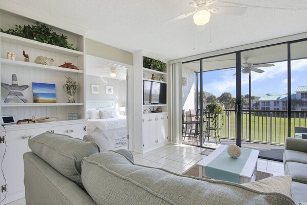 "Barefoot is Better" in this lovely, upgraded 2nd floor 1 bedroom Villa. This condo is spacious, very light and bright! The kitchen is ample and updated with seating for 4 at the bar. The living room offers a queen sized sleeper sofa, ceiling fan and ocean peeks. The screened in balcony overlooks the golf course. The bedroom is outfitted with a King sized bed and a flat screen television for your enjoyment. The bathroom offers updated vanities.