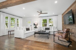 In the heart of Fredericksburg, The Rosemary offers a charming retreat with modern comforts. Unwind in the cozy backyard with a grill and fire-pit, or enjoy quality time in the spacious living area with two large couches and a 65-inch TV. A fully equipped kitchen, coffee bar, flatscreen TVs in each bedroom make this home perfect for families or friends.