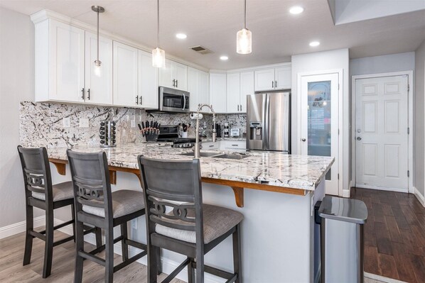 The kitchen comes fully equipped with everything you would need to cook up all your favorite meals, from the oven, to the microwave, to the toaster and blender, to the spacious fridge/freezer.