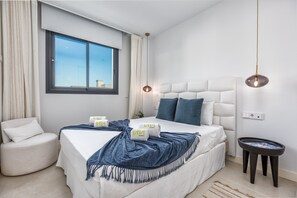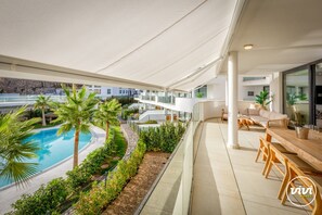 Escape to Terra, a modern apartment with stunning views of the communal pool and hills. Conveniently located near transportation hubs like Carvajal bus station and train station, this comfortable retreat features an open kitchen equipped with all essentials, a coffee maker, toaster and kettle for effortless meal prep.