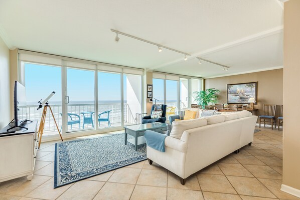 The open-concept living room, with the relaxing view of the beach and flooded with natural light, is the perfect space to unwind! Leave your cares, pool towels, and other amenities behind. Our kitchen comes fully stocked with dishes and appliances.