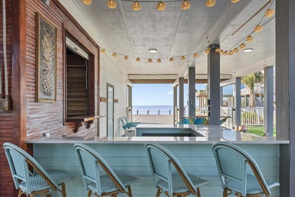 Step outside to discover a wrap-around porch and sun deck, beckoning you to dine al fresco and savor the coastal breeze. The downstairs entertainment area is a treat in itself, featuring an outdoor bathroom, a newly installed bar area with table top seating, a TV to watch your favorite sports or Netflix show, a fireplace for ambiance and a hot tub for relaxing in the day or night.