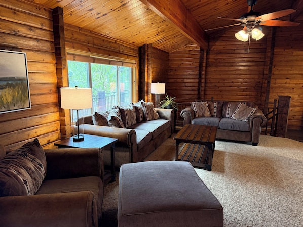 Inside, the cabin features 5 bedrooms, including a primary suite with private bath and workspace. There are two living areas: an upstairs lounge with comfortable sofas, and a downstairs area with a large sectional and flatscreen TV. All bedrooms except the bunk room have flatscreen TVs with streaming services. The cabin is stocked with games, puzzles, books, and toys for all ages.