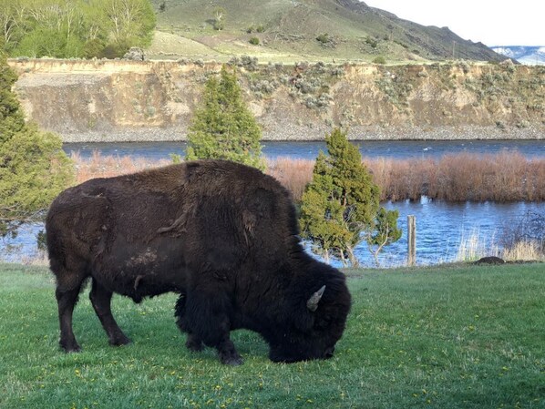 We do occasionally see bears, mountain lions, wolves, bison and rattlesnakes on the property and we frequently have deer and elk - especially in the spring and fall. The property does have exterior cameras to for the protection and safety of our property and guests. Many times the elk will eat right outside the patio and bed down for the day. Please do not approach or feed any of the wildlife. You should always maintain 25 yards distance between elk, deer & bison and 100 yards from bears, wolves and mountain lions.