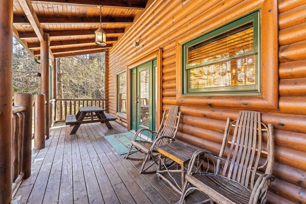 Step onto the front porch and you’ll find classic rocking chairs and a picnic table, perfect for morning coffee or an evening meal surrounded by nature. Inside, the fully equipped kitchen features both a standard coffee maker and a Keurig, sleek black appliances, natural wood cabinetry, and ample counterspace—making it easy to prepare meals or snacks during your stay. After taking a quick peek in the kitchen, head out to the back deck where you’ll discover a private haven with a soothing hot tub, additional rocking chairs, and a charming porch swing—all framed by serene, tree-lined mountain views that create a tranquil backdrop for your stay.