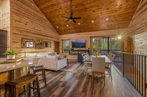Entertainment is everywhere at Woody's Mountain Lodge. Both the main living room and the downstairs common area are equipped with large-screen smart TVs, perfect for movie nights or game-day gatherings. The lower-level entertainment area also boasts a large sectional couch, a shuffleboard table, and a two-player arcade game, creating the ultimate hangout spot. A set of built-in twin bunk beds with private large-screen smart TVs offers kids and teens a fun and cozy place to unwind.