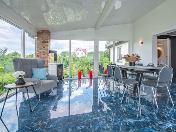 Single-family house "Country House Premium", renovated in 2022. 10 km from the lake, in the countryside. Private: property 3'000 m2 (fenced), garden 100 m2, meadow 2'000 m2, swimming pool (above ground) (2 x 4 m, depth 110 - 110 cm, seasonal availability: 01.Jun. - 30.Aug.). In the house: infrared sauna, billiard table, table football, washing machine, tumble dryer. Available: bicycles. Parking on the premises. Shop 2 km, grocery 6 km, supermarket 6 km, restaurant 6 km, bus stop 40 m, railway station 12 km, 70 m, public bathing area 10 km. Nearby attractions: Międzyzdroje 90 km. Well-known lakes can easily be reached: Dobre 10 km. Please note: The owner does not accept any youth groups. Fishing [permit required]. Animals in the neighbourhood. There is a key box by the entrance door (self-check-in possible).