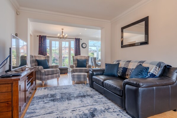 The spacious living area spans the length of the left side of the property with comfortable seating for six with sofas and armchairs. There is a modern electric fire and Smart TV with Sky (including Sky Sports), Netflix and a DVD player. This continues into the bright and airy kitchen and dining areas which overlook the pretty garden. The well equipped kitchen has a high level electric oven, hob, Nespresso machine, slow cooker, under counter fridge and full size dishwasher. There is an additional fridge/freezer and washer/dryer in the garage. There is a large oak dining table and chairs. Access to the garden is through the double patio doors.