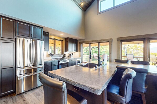 Inside, warm wood tones, premium finishes, multiple gathering spaces, and a master suite with its own fireplace create a relaxed mountain-luxury feel perfect for large groups.