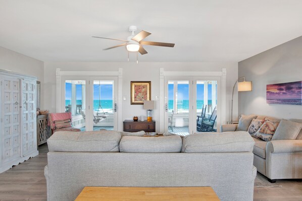 Wherever you are in the house, the Gulf takes center stage. Wake up in one of TWO beachfront bedrooms and take in the views of the water. Even better, both of these bedrooms have sliding-door access to their own private deck with Gulf views! A nautical-themed third bedroom features two twin beds and an attached half-bath.. Two full bathrooms include a master with a walk-in shower and a guest bath. Sandy after a day at the beach? Not a problem. Just step into the enclosed and totally private outdoor shower and get clean under the blue skies. At dinnertime, the stocked kitchen provides all the appliances, pots, pans, cookware, and dishes your group needs to cook and eat. Feast together in full view of the Gulf on the screened porch with a table for six. After the meal, load the dishwasher, then stick around for a game of cards and a spectacular sunset show. On a rainy day, there is a second dining table for six located inside. Watch a DVD in the living area TV or stretch out on the sofa with a good book. Thanks to the open layout in the living space, everyone can spend time together and do their own thing, too.