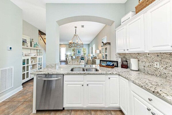 Kitchen & Dining: Fully equipped kitchen with stainless steel appliances, granite countertops, and seating for the whole group.