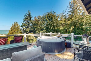 Luxurious water view home surrounded by wildlife and a private hot tub provides amenities, such as a garden and a hot tub.