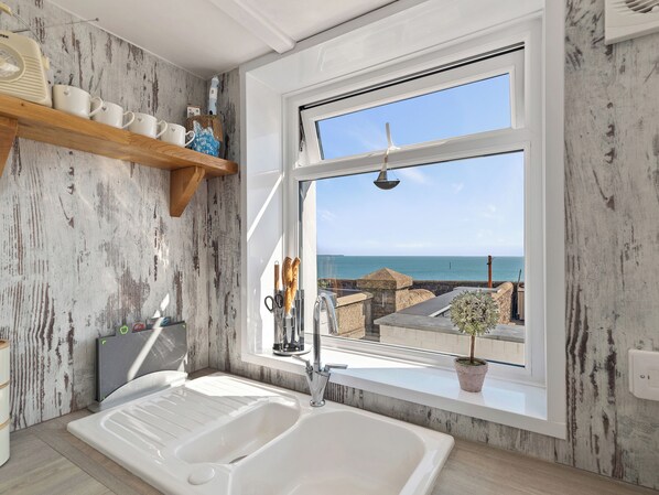 Separate Toilet.. Central heating, electricity, bed linen, towels and Wi-fi included. High chair available on request. Starter pack of logs provided, more available requiring small fee. Enclosed garden wiith outdoor furniture. Access to cliffs and seating area via gate. Private parking. Please note: Children to be supervised when accessing the gate.. This exciting property has many thrilling features to offer. The living area is a winning combination of earthy colours and interesting furnishings, along side a cosy log burner to relax in front of while settling into the congenial seating. Wooden floors and solid, pine furniture creates a style of understated luxury that blends effortlessly with the surroundings. On the first floor, two immaculately presented bedrooms that come with crisp white bedlinen, cushions and snug throws alongside quality mattresses which should aid a restful sleep as you listen to the sound of the waves. The property has also recently installed full fibre broadband; perfect for families with multiple devices or home working.