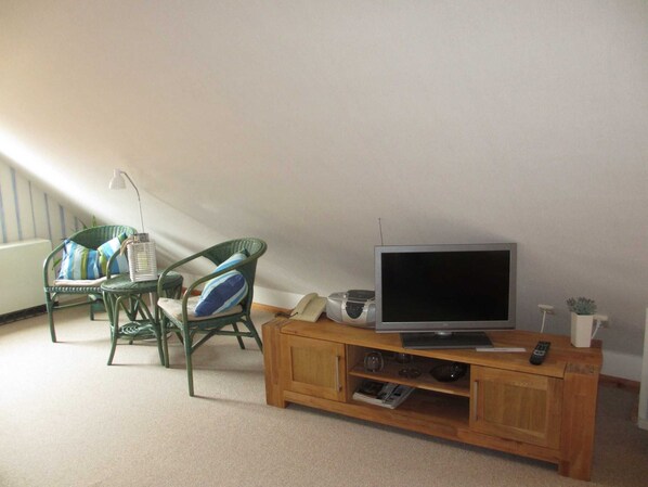 This apartment is located on the upper floor on the north side of the house and has a size of approx. 25 m² incl. Sloping ceilings. During the day you can see the lighthouse from there and at night it shines in your window if you like! Since you can also see the harbor entrance from Kloster with the salt marshes in front of it, you can observe how the ships “sail across the meadow”. The distribution of the apartment includes a combined living room with kitchenette and bathroom with shower and toilet. The equipment includes a double bed with a total size of 1.60mx 2.00m. In the living area, if an extra bed is desired, there is a double bed couch. There is also WiFi, a television, radio with CD player. The kitchen has the following equipment, mini kitchen with fridge including a small freezer, coffee machine, kettle, toaster and various Dishes and kitchen utensils. Bed linen, towels and tea towels are part of the basic equipment. For breakfast outdoors, at appropriate temperatures, garden furniture standing on the lawn in front of the house can be used