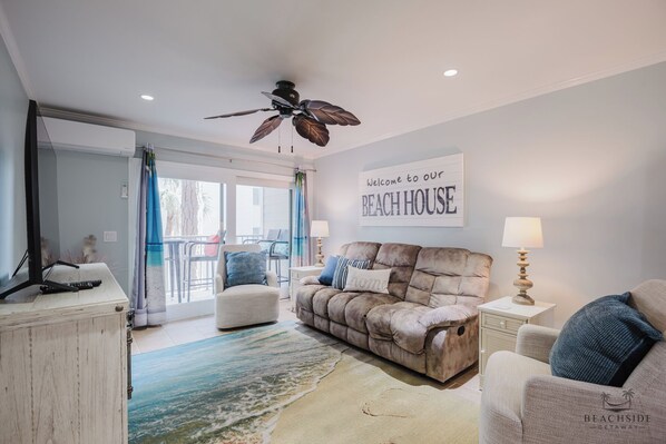 "Welcome to your home away from home! This breezy beach villa features an inviting open floor plan that's perfect for family time. Stretch out in the living room on the brand-new reclining sofa or curl up in one of two comfy armchairs - perfect for swapping stories about your beach adventures! The dining area seats four, ideal for enjoying home-cooked meals or takeout from nearby Coligny Plaza.