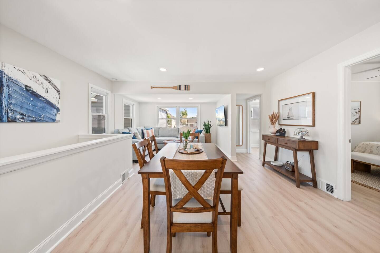 Just outside the kitchen window cut out is the large dining room table which seats up to 6 and is perfectly located between the kitchen and living areas. The living area has two plush swivel chairs and a comfortable pullout sofa which can be converted to a bed for two additional guests to accommodate larger group sleeping arrangements. The chairs and couch face a petite beautifully decorated fireplace and a large smart TV available for all the high demand streaming apps.