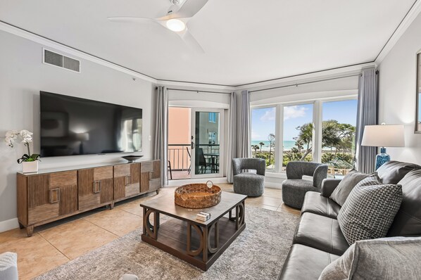 Moving into the unit past the dining table & lighting, guests will enter the living area with all new decor including a 75” TV, ceiling fan and queen sleeper sofa. The large window allows guest to enjoy the beautiful lagoon, pool and ocean views. The sliding door opens to the ocean oriented private balcony with new outdoor dining table and chairs.