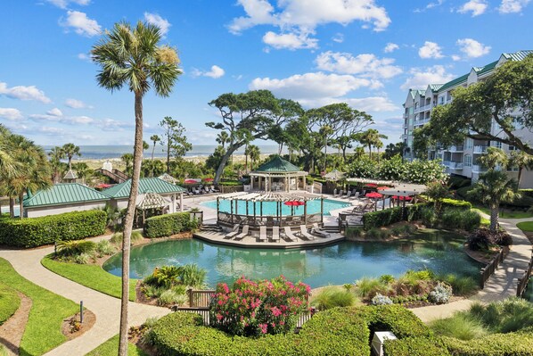 Windsor Court, nestled along one of Hilton Head Island's most pristine beaches, is surrounded by beautifully landscaped gardens, walkways, lagoons, fountains, and ancient live oaks. The complex boasts extensive amenities, including two large oceanfront pools—a kids' pool with a graduated entry and a mushroom-shaped waterfall—and a hot tub. Enjoy the large sundeck, poolside restrooms, showers, a covered pavilion with a grilling area, elevator access, and covered parking. A private boardwalk provides direct beach access, and the pool is heated seasonally. For added convenience, the complex also offers a storage locker in the garage for your beach gear.