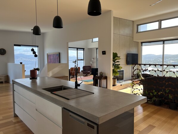 Suitable for short or long stays, this house is luxurious, spacious and full of charm, with panoramic views over the river Derwent looking towards the city and Mount Wellington. The view is magnificent day and night, every day is different and the varying palette of colours and hues of the vista is awe inspiring.