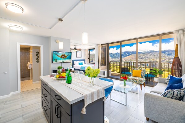 Perched on the 34th floor, this apartment boasts breathtaking mountain and city views, visible from the living room, bedroom, and balcony. The best part? It's just a leisurely stroll away from the world-famous Waikiki beach – an unparalleled location for an unforgettable vacation.